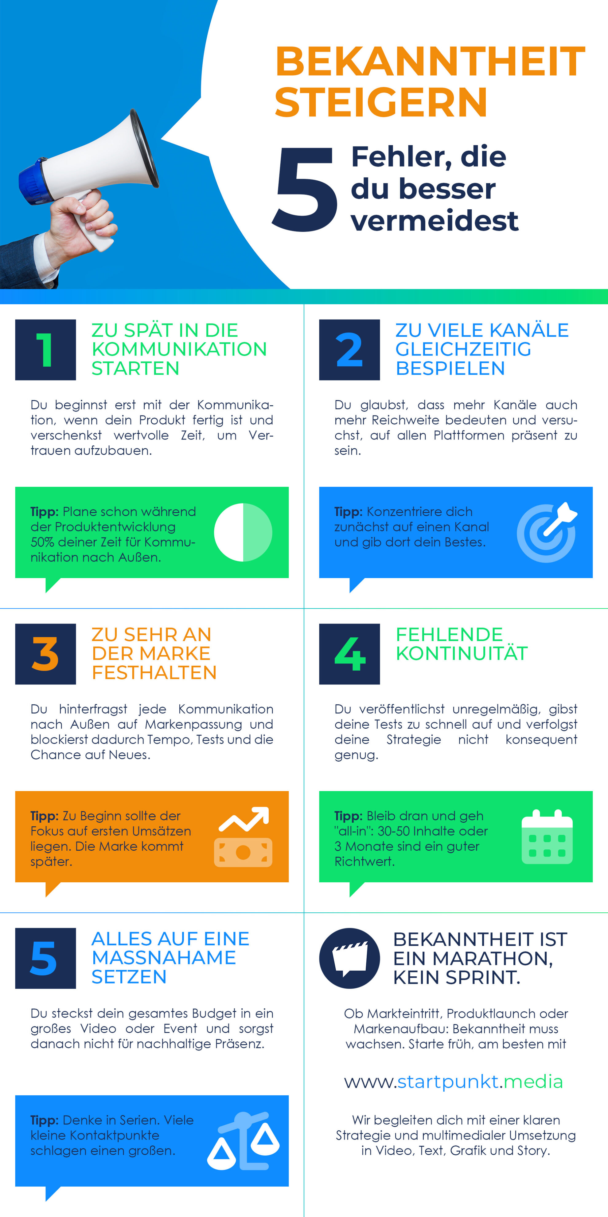 Hi, wir sind Startpunkt Media, und wir unterstützen KMU, Gründer und Forschende dabei, bekannter zu werden und ihre Marke sichtbarer zu machen – beim Markteintritt, Produktlaunch oder Markenaufbau. Begonnen bei einer klaren Strategie bis zur multimedialen Umsetzung in Video, Text, Grafik und Storys, begleiten wir dich von der ersten Idee und helfen dir, sie auf die Straße zu bringen.